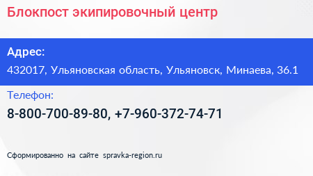 Блокпост, экипировочный центр по адресу 432017, Ульяновская область, Ульяновск, Минаева, 36.1 в дальнейшем Организация, размещена в следующих категориях: