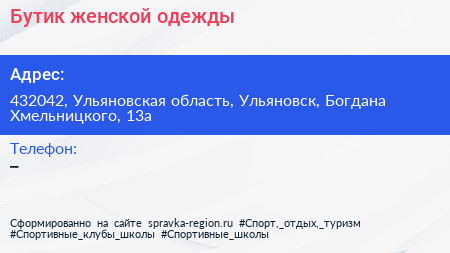 Бутик женской одежды по адресу 432042, Ульяновская область, Ульяновск, Богдана Хмельницкого, 13а в дальнейшем Организация, размещена в следующих категориях: