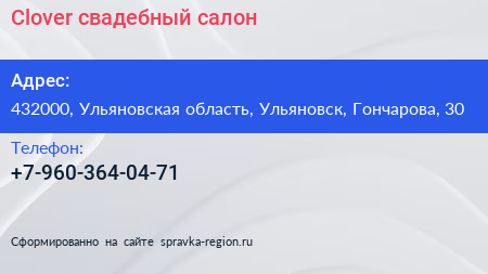 Clover, свадебный салон по адресу 432000, Ульяновская область, Ульяновск, Гончарова, 30 в дальнейшем Организация, размещена в следующих категориях: