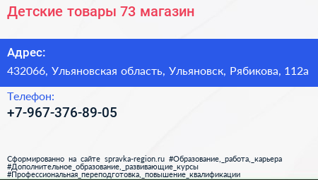 Детские товары-73, магазин по адресу 432066, Ульяновская область, Ульяновск, Рябикова, 112а в дальнейшем Организация, размещена в следующих категориях: