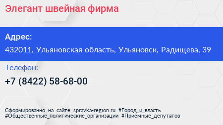 Элегант, швейная фирма по адресу 432011, Ульяновская область, Ульяновск, Радищева, 39 в дальнейшем Организация, размещена в следующих категориях: