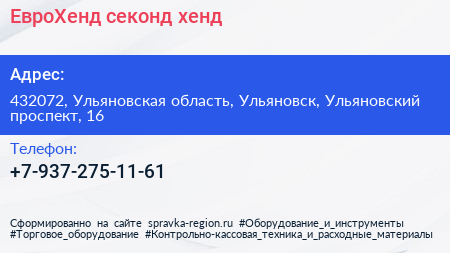 ЕвроХенд, секонд-хенд по адресу 432072, Ульяновская область, Ульяновск, Ульяновский проспект, 16 в дальнейшем Организация, размещена в следующих категориях: