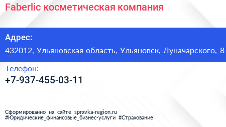 Faberlic, косметическая компания по адресу 432012, Ульяновская область, Ульяновск, Луначарского, 8 в дальнейшем Организация, размещена в следующих категориях: