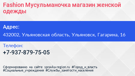 Fashion Мусульманочка, магазин женской одежды по адресу 432002, Ульяновская область, Ульяновск, Гагарина, 16 в дальнейшем Организация, размещена в следующих категориях: