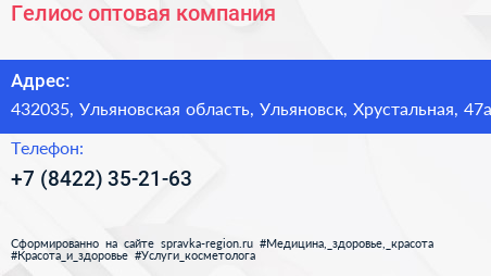 Гелиос, оптовая компания по адресу 432035, Ульяновская область, Ульяновск, Хрустальная, 47а в дальнейшем Организация, размещена в следующих категориях: