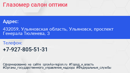 Глазомер, салон оптики по адресу 432059, Ульяновская область, Ульяновск, проспект Генерала Тюленева, 3 в дальнейшем Организация, размещена в следующих категориях: