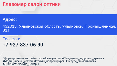 Глазомер, салон оптики по адресу 432013, Ульяновская область, Ульяновск, Промышленная, 81а в дальнейшем Организация, размещена в следующих категориях: