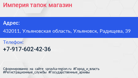 Империя тапок, магазин по адресу 432011, Ульяновская область, Ульяновск, Радищева, 39 в дальнейшем Организация, размещена в следующих категориях:
