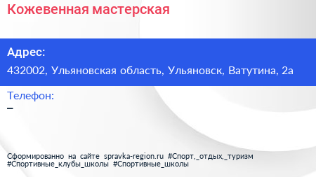 Кожевенная мастерская по адресу 432002, Ульяновская область, Ульяновск, Ватутина, 2а в дальнейшем Организация, размещена в следующих категориях:
