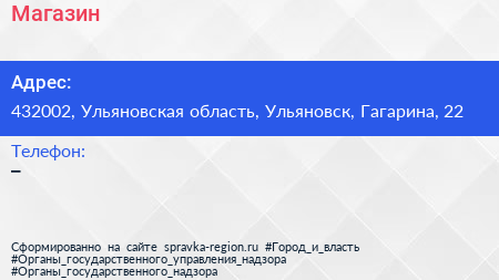 Магазин по адресу 432002, Ульяновская область, Ульяновск, Гагарина, 22 в дальнейшем Организация, размещена в следующих категориях: