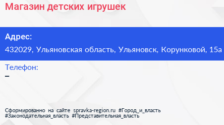 Магазин детских игрушек по адресу 432029, Ульяновская область, Ульяновск, Корунковой, 15а в дальнейшем Организация, размещена в следующих категориях:
