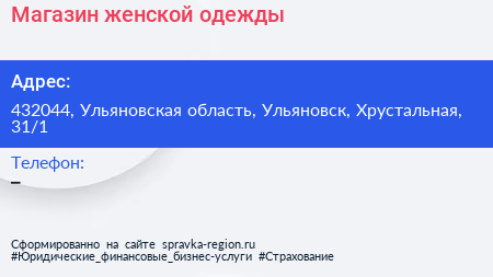 Магазин женской одежды по адресу 432044, Ульяновская область, Ульяновск, Хрустальная, 31/1 в дальнейшем Организация, размещена в следующих категориях:
