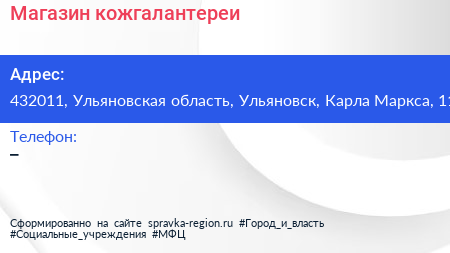 Магазин кожгалантереи по адресу 432011, Ульяновская область, Ульяновск, Карла Маркса, 11 в дальнейшем Организация, размещена в следующих категориях: