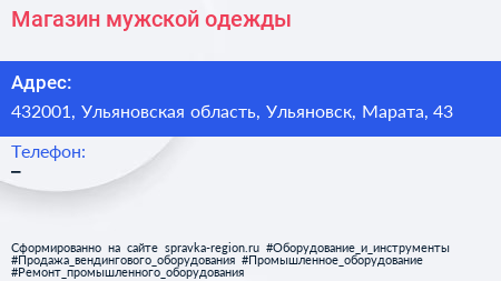 Магазин мужской одежды по адресу 432001, Ульяновская область, Ульяновск, Марата, 43 в дальнейшем Организация, размещена в следующих категориях: