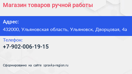 Магазин товаров ручной работы по адресу 432000, Ульяновская область, Ульяновск, Дворцовая, 4а в дальнейшем Организация, размещена в следующих категориях: