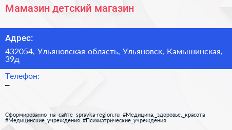Мамазин, детский магазин по адресу 432054, Ульяновская область, Ульяновск, Камышинская, 39д в дальнейшем Организация, размещена в следующих категориях: