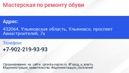 Мастерская по ремонту обуви по адресу 432064, Ульяновская область, Ульяновск, проспект Авиастроителей, 7а в дальнейшем Организация, размещена в следующих категориях: