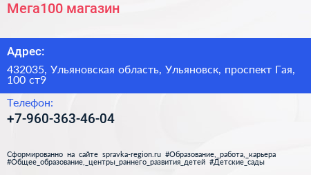 Мега100, магазин по адресу 432035, Ульяновская область, Ульяновск, проспект Гая, 100 ст9 в дальнейшем Организация, размещена в следующих категориях: