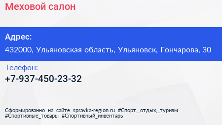 Меховой салон по адресу 432000, Ульяновская область, Ульяновск, Гончарова, 30 в дальнейшем Организация, размещена в следующих категориях: