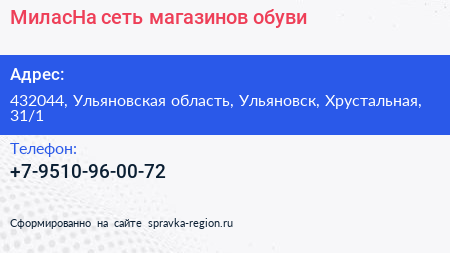 МиласНа, сеть магазинов обуви по адресу 432044, Ульяновская область, Ульяновск, Хрустальная, 31/1 в дальнейшем Организация, размещена в следующих категориях: