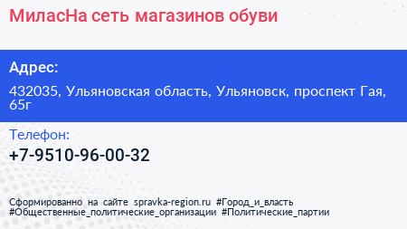 МиласНа, сеть магазинов обуви по адресу 432035, Ульяновская область, Ульяновск, проспект Гая, 65г в дальнейшем Организация, размещена в следующих категориях: