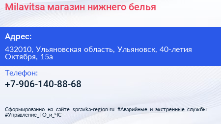 Milavitsa, магазин нижнего белья по адресу 432010, Ульяновская область, Ульяновск, 40-летия Октября, 15а в дальнейшем Организация, размещена в следующих категориях: