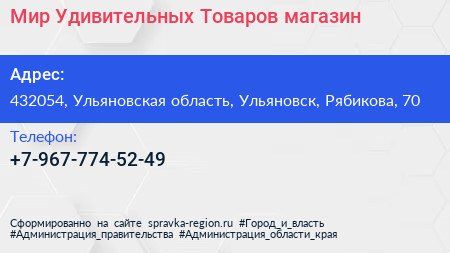 Мир Удивительных Товаров, магазин по адресу 432054, Ульяновская область, Ульяновск, Рябикова, 70 в дальнейшем Организация, размещена в следующих категориях: