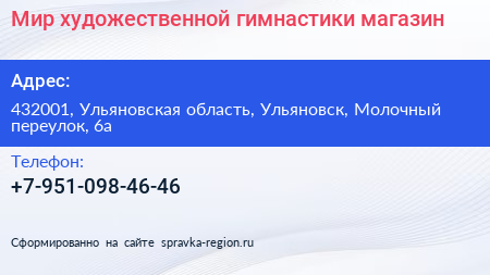 Мир художественной гимнастики, магазин по адресу 432001, Ульяновская область, Ульяновск, Молочный переулок, 6а в дальнейшем Организация, размещена в следующих категориях: