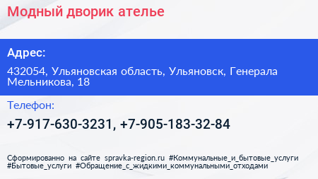 Модный дворик, ателье по адресу 432054, Ульяновская область, Ульяновск, Генерала Мельникова, 18 в дальнейшем Организация, размещена в следующих категориях: