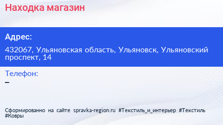 Находка, магазин по адресу 432067, Ульяновская область, Ульяновск, Ульяновский проспект, 14 в дальнейшем Организация, размещена в следующих категориях: