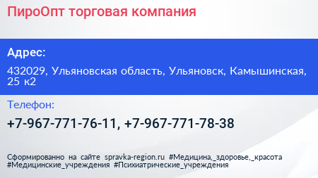 ПироОпт, торговая компания по адресу 432029, Ульяновская область, Ульяновск, Камышинская, 25 к2 в дальнейшем Организация, размещена в следующих категориях: