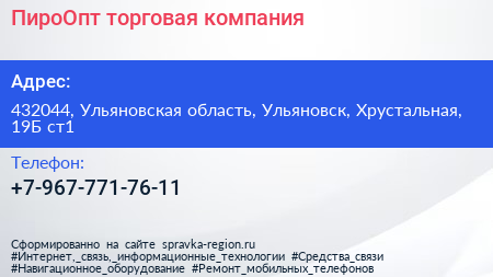 ПироОпт, торговая компания по адресу 432044, Ульяновская область, Ульяновск, Хрустальная, 19Б ст1 в дальнейшем Организация, размещена в следующих категориях: