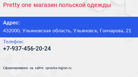 Pretty one, магазин польской одежды по адресу 432000, Ульяновская область, Ульяновск, Гончарова, 21 в дальнейшем Организация, размещена в следующих категориях: