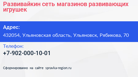 Развивайкин, сеть магазинов развивающих игрушек по адресу 432054, Ульяновская область, Ульяновск, Рябикова, 70 в дальнейшем Организация, размещена в следующих категориях: