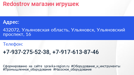 Redostrov, магазин игрушек по адресу 432072, Ульяновская область, Ульяновск, Ульяновский проспект, 16 в дальнейшем Организация, размещена в следующих категориях: