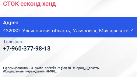 СТОК, секонд-хенд по адресу 432030, Ульяновская область, Ульяновск, Маяковского, 4 в дальнейшем Организация, размещена в следующих категориях: