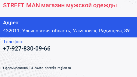 STREET MAN, магазин мужской одежды по адресу 432011, Ульяновская область, Ульяновск, Радищева, 39 в дальнейшем Организация, размещена в следующих категориях: