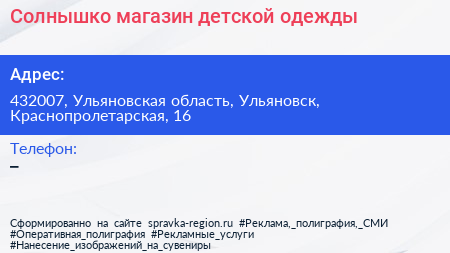 Солнышко, магазин детской одежды по адресу 432007, Ульяновская область, Ульяновск, Краснопролетарская, 16 в дальнейшем Организация, размещена в следующих категориях: