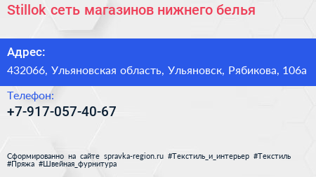 Stillok, сеть магазинов нижнего белья по адресу 432066, Ульяновская область, Ульяновск, Рябикова, 106а в дальнейшем Организация, размещена в следующих категориях:
