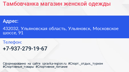 Тамбовчанка, магазин женской одежды по адресу 432032, Ульяновская область, Ульяновск, Московское шоссе, 91 в дальнейшем Организация, размещена в следующих категориях:
