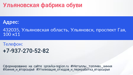 Ульяновская фабрика обуви по адресу 432035, Ульяновская область, Ульяновск, проспект Гая, 100 к11 в дальнейшем Организация, размещена в следующих категориях: