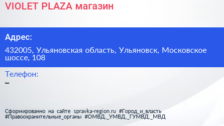 VIOLET PLAZA, магазин по адресу 432005, Ульяновская область, Ульяновск, Московское шоссе, 108 в дальнейшем Организация, размещена в следующих категориях: