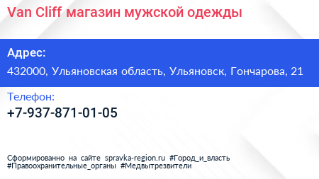 Van Cliff, магазин мужской одежды по адресу 432000, Ульяновская область, Ульяновск, Гончарова, 21 в дальнейшем Организация, размещена в следующих категориях: