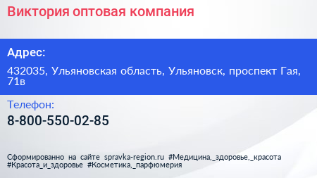 Виктория, оптовая компания по адресу 432035, Ульяновская область, Ульяновск, проспект Гая, 71в в дальнейшем Организация, размещена в следующих категориях:
