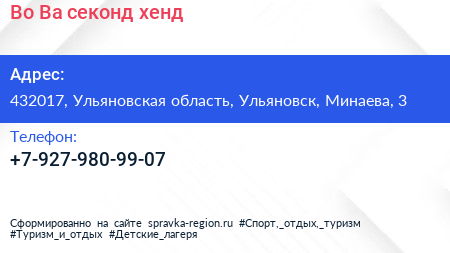 Во!Ва!, секонд-хенд по адресу 432017, Ульяновская область, Ульяновск, Минаева, 3 в дальнейшем Организация, размещена в следующих категориях: