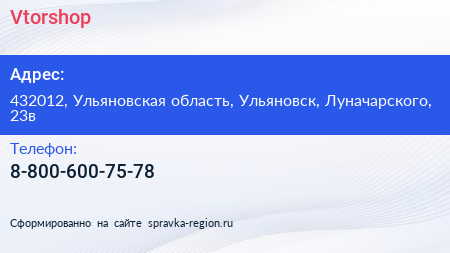 Vtorshop по адресу 432012, Ульяновская область, Ульяновск, Луначарского, 23в в дальнейшем Организация, размещена в следующих категориях: