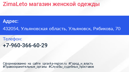 ZimaLeto, магазин женской одежды по адресу 432054, Ульяновская область, Ульяновск, Рябикова, 70 в дальнейшем Организация, размещена в следующих категориях: