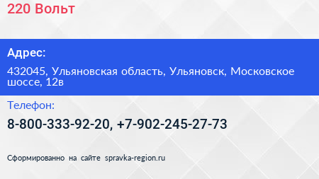 220 Вольт по адресу 432045, Ульяновская область, Ульяновск, Московское шоссе, 12в в дальнейшем Организация, размещена в следующих категориях: