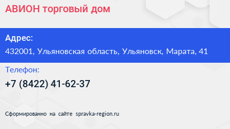 АВИОН, торговый дом по адресу 432001, Ульяновская область, Ульяновск, Марата, 41 в дальнейшем Организация, размещена в следующих категориях: