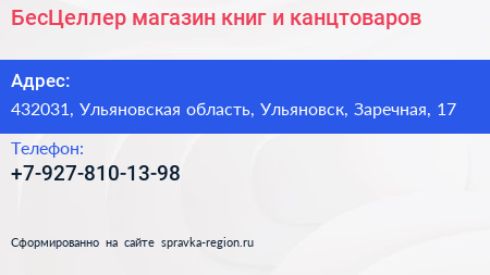 БесЦеллер, магазин книг и канцтоваров по адресу 432031, Ульяновская область, Ульяновск, Заречная, 17 в дальнейшем Организация, размещена в следующих категориях: